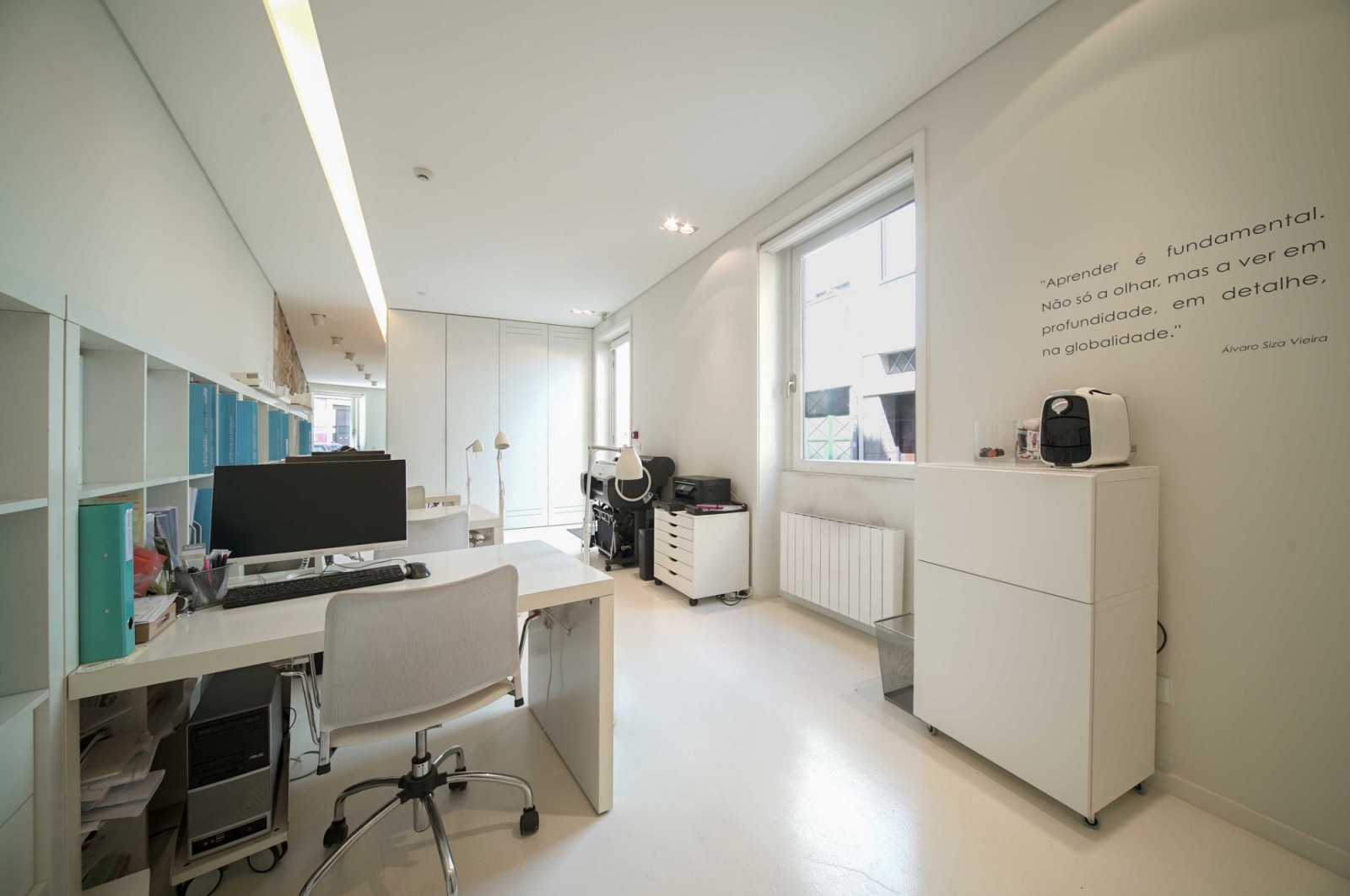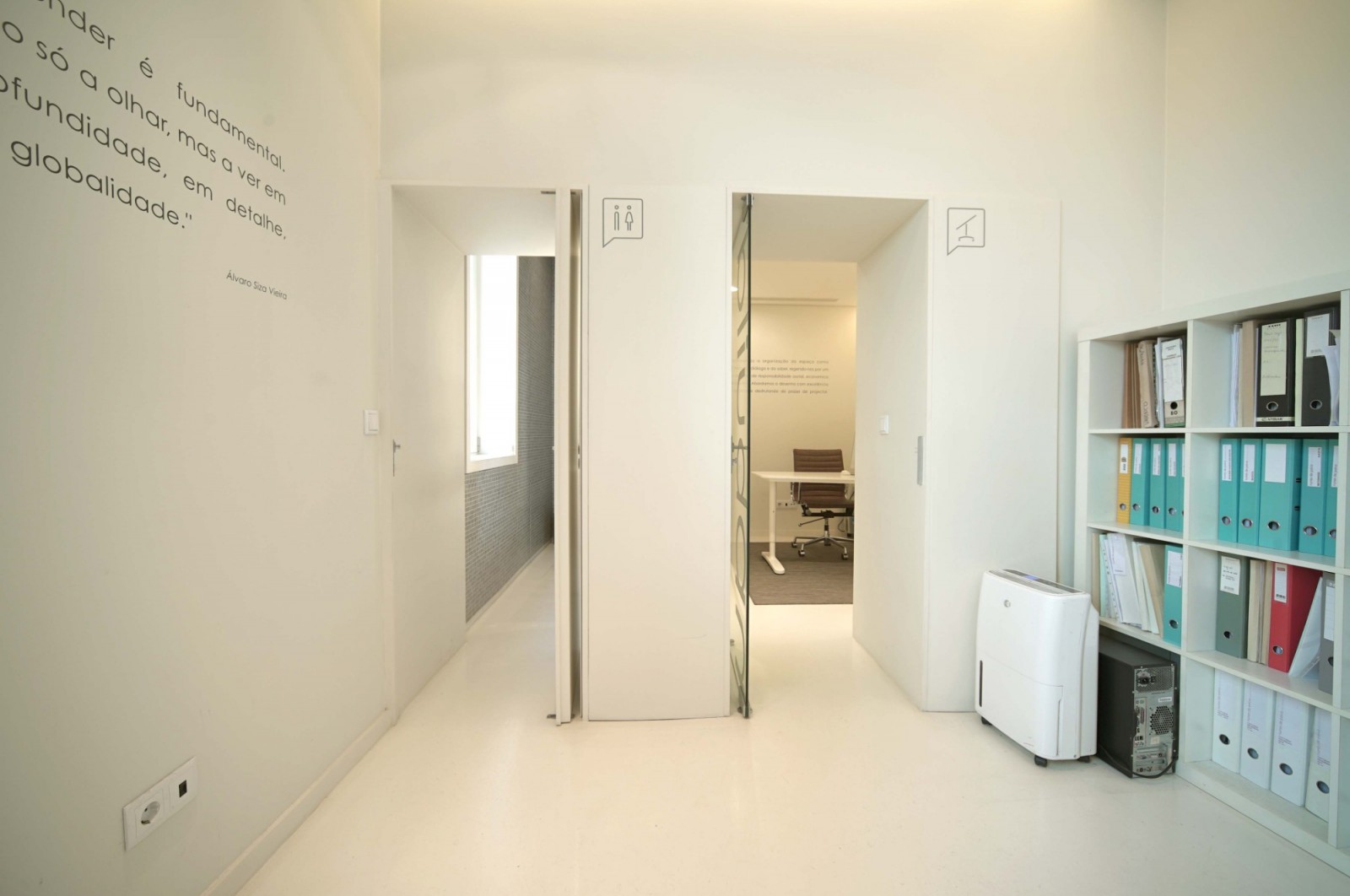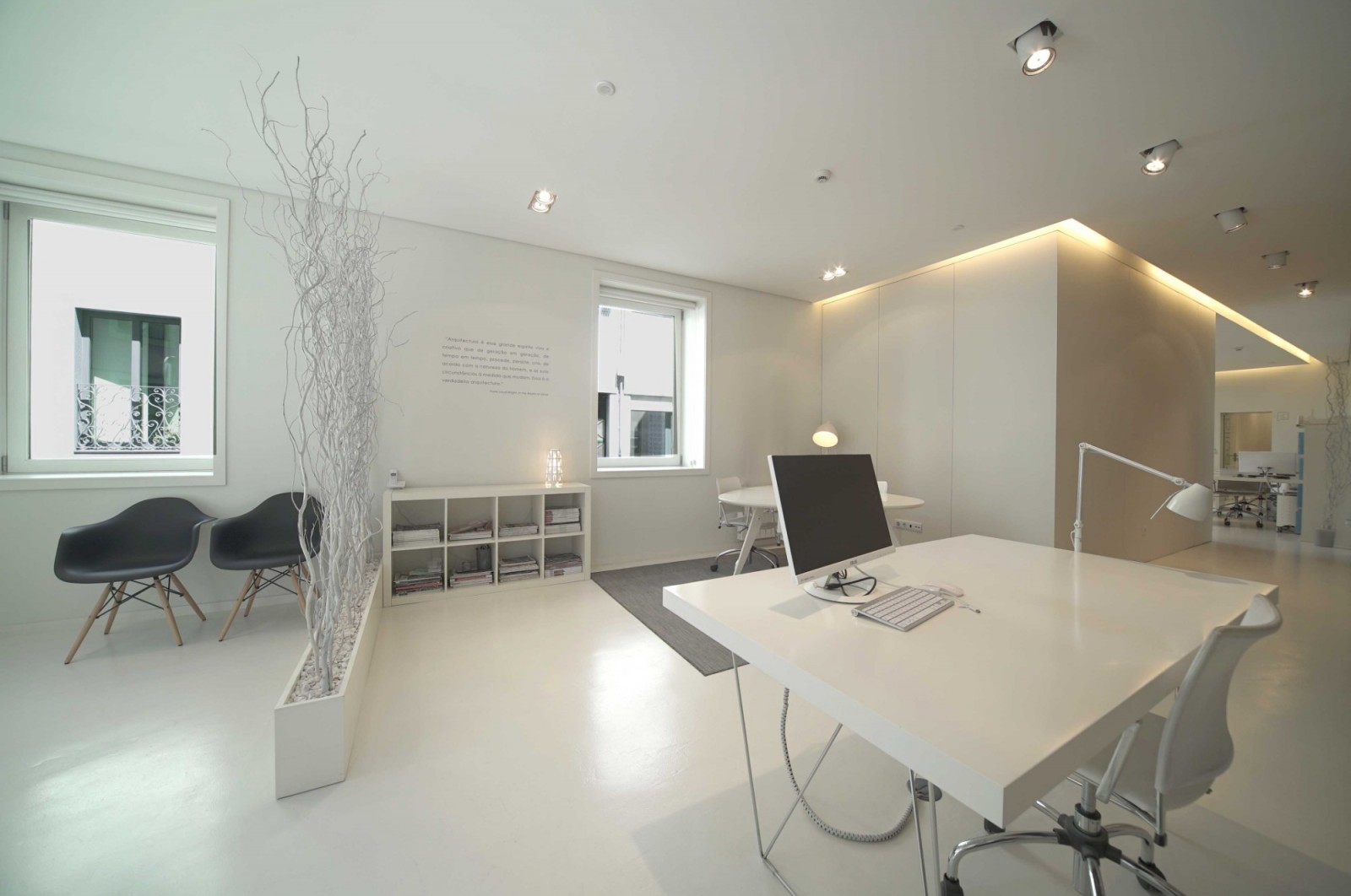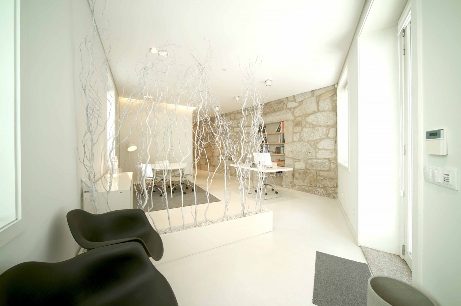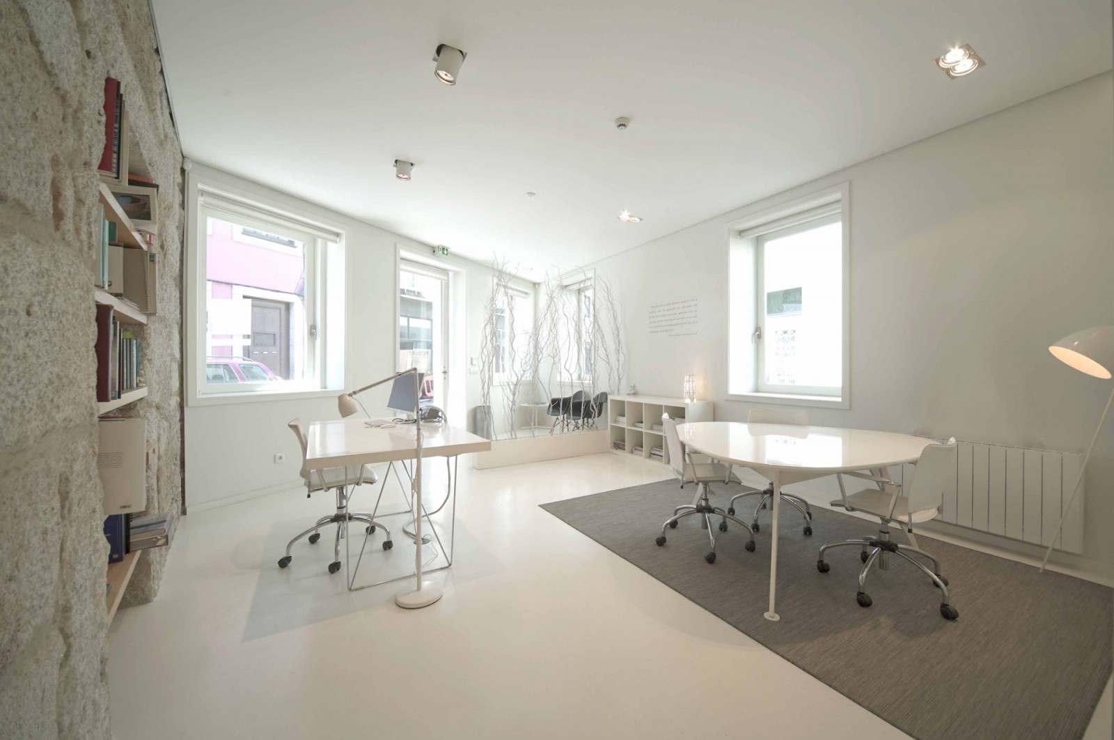 - Entrada pela Rua de Coelho Neto: uma zona de cariz mais público dispondo de uma zona de recepção e sala de reuniões;
