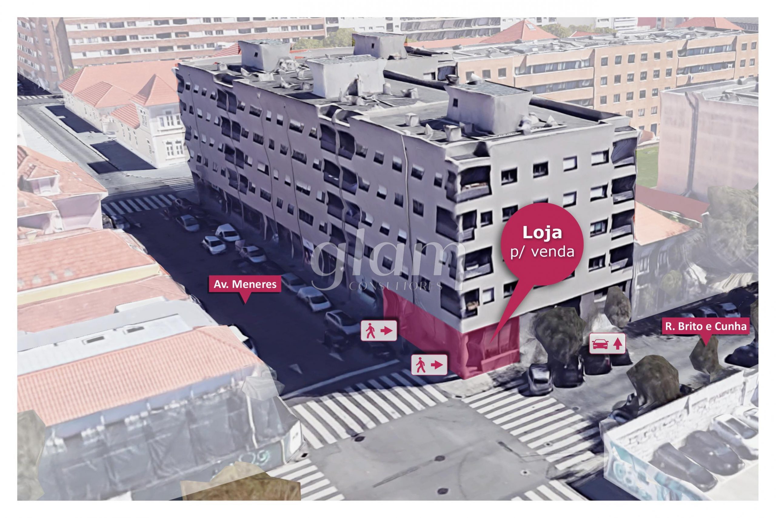 loja com 2 pontos de acesso pedonal (um no próprio gaveto e outro através da Av.Menéres). Dispõe ainda de um acesso automóvel à garagem que permite