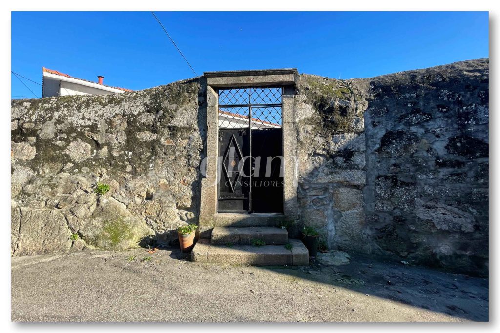 Ao passarmos o portão de entrada pedonal recebe-nos um pátio privado, por onde acedemos ao piso superior desta moradia construída integralmente em pedra.