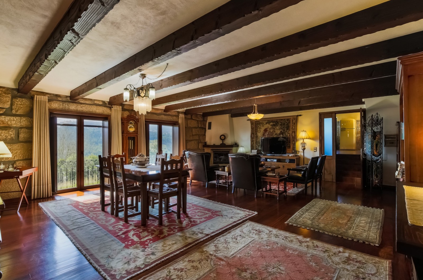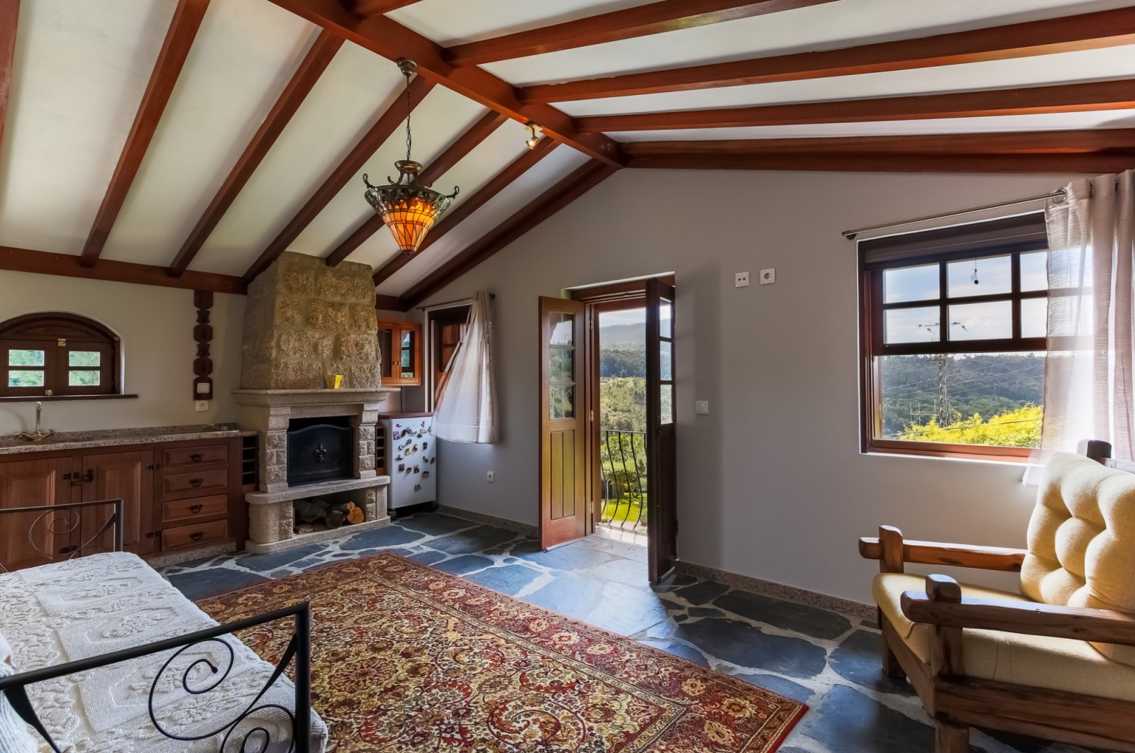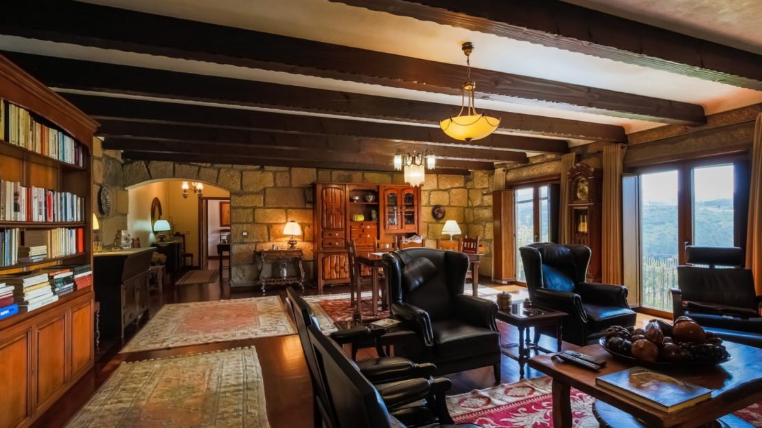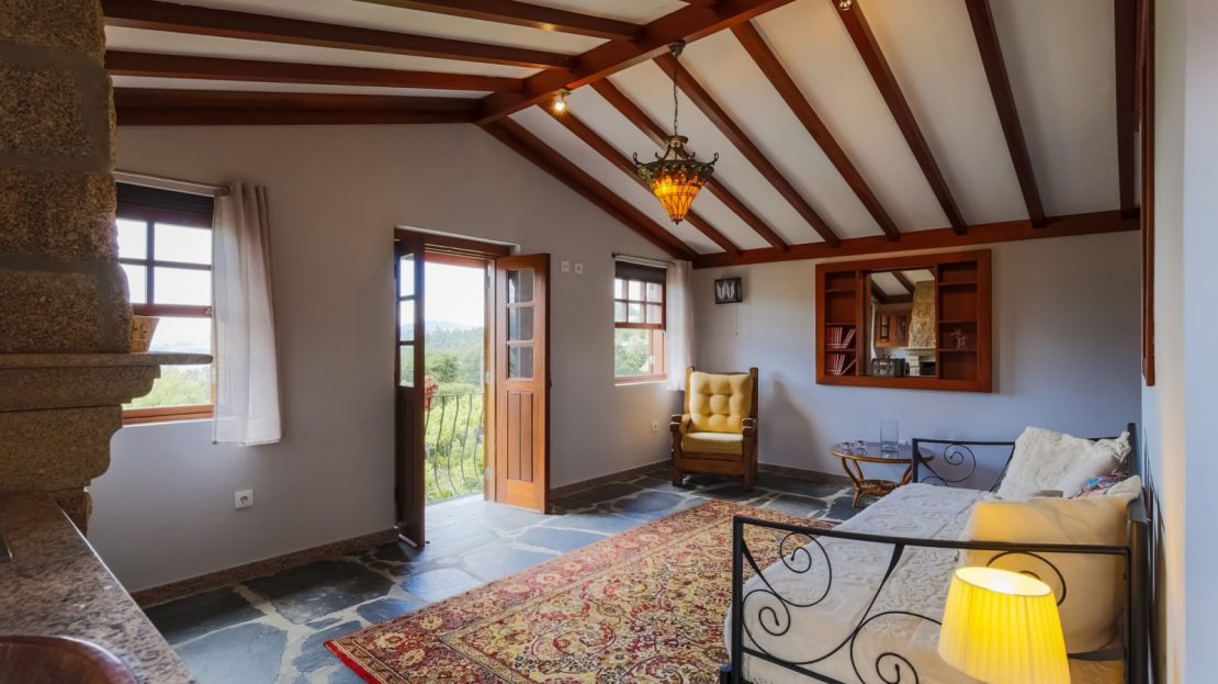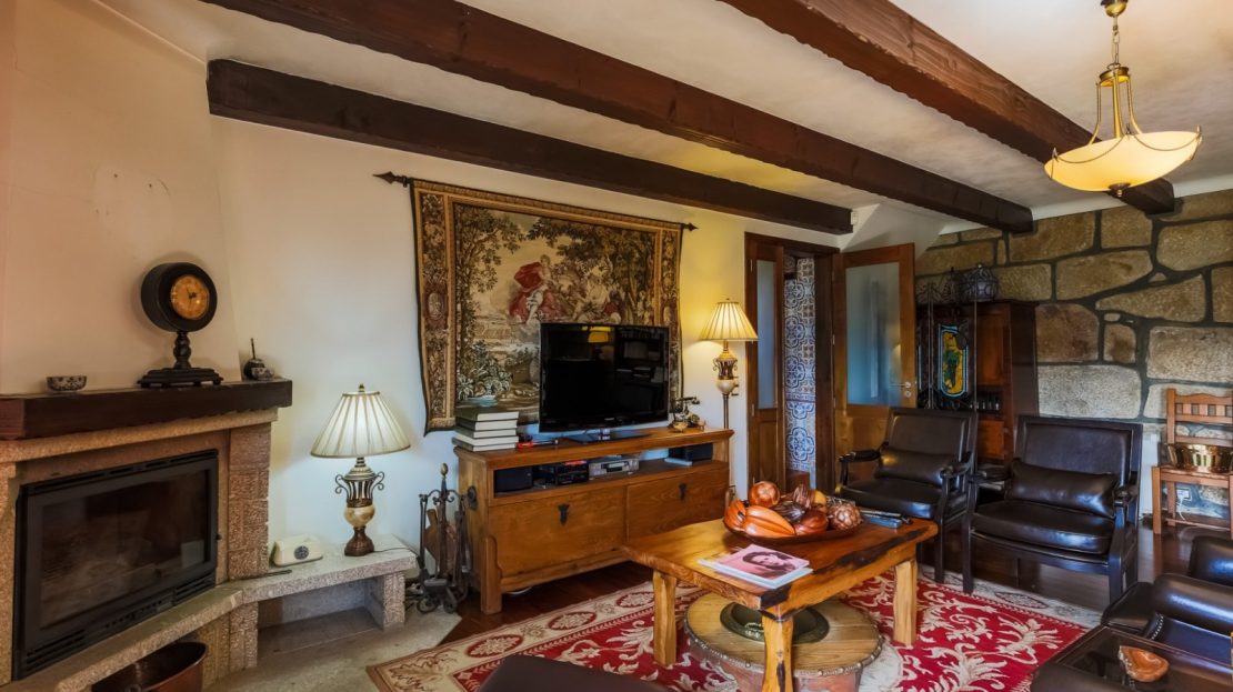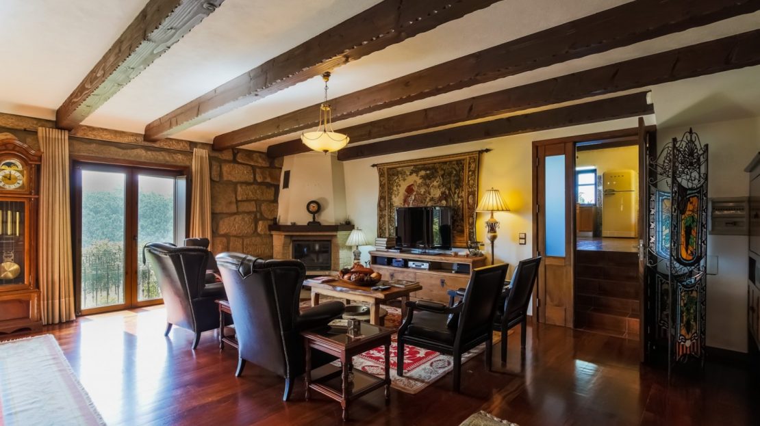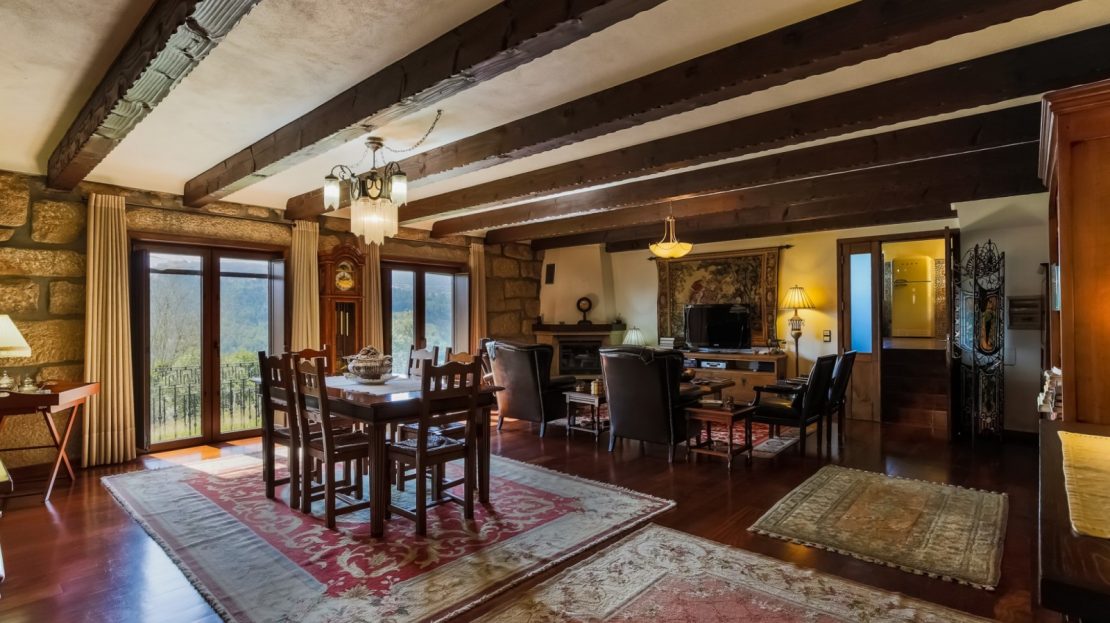 - salão com paredes em pedra à vista, lareira, tecto com vigas em madeira à vista e acesso ao jardim com vistas rio;