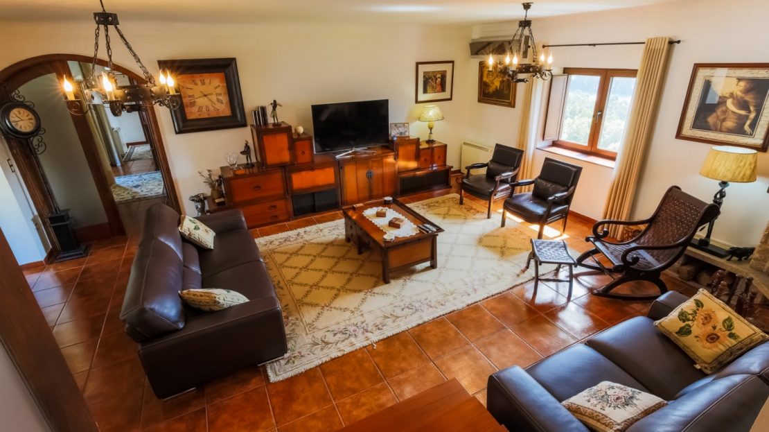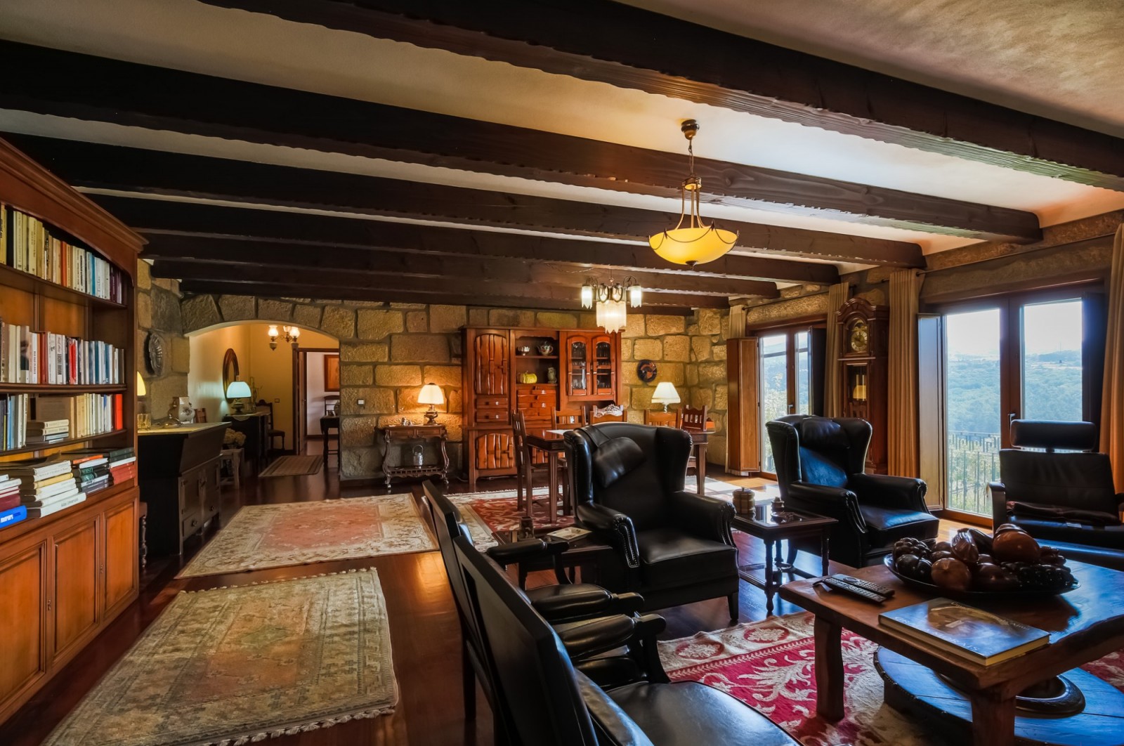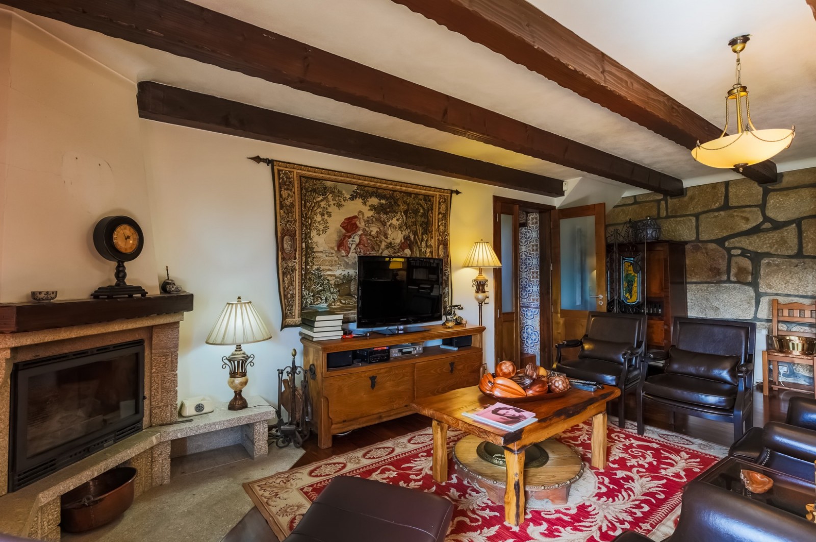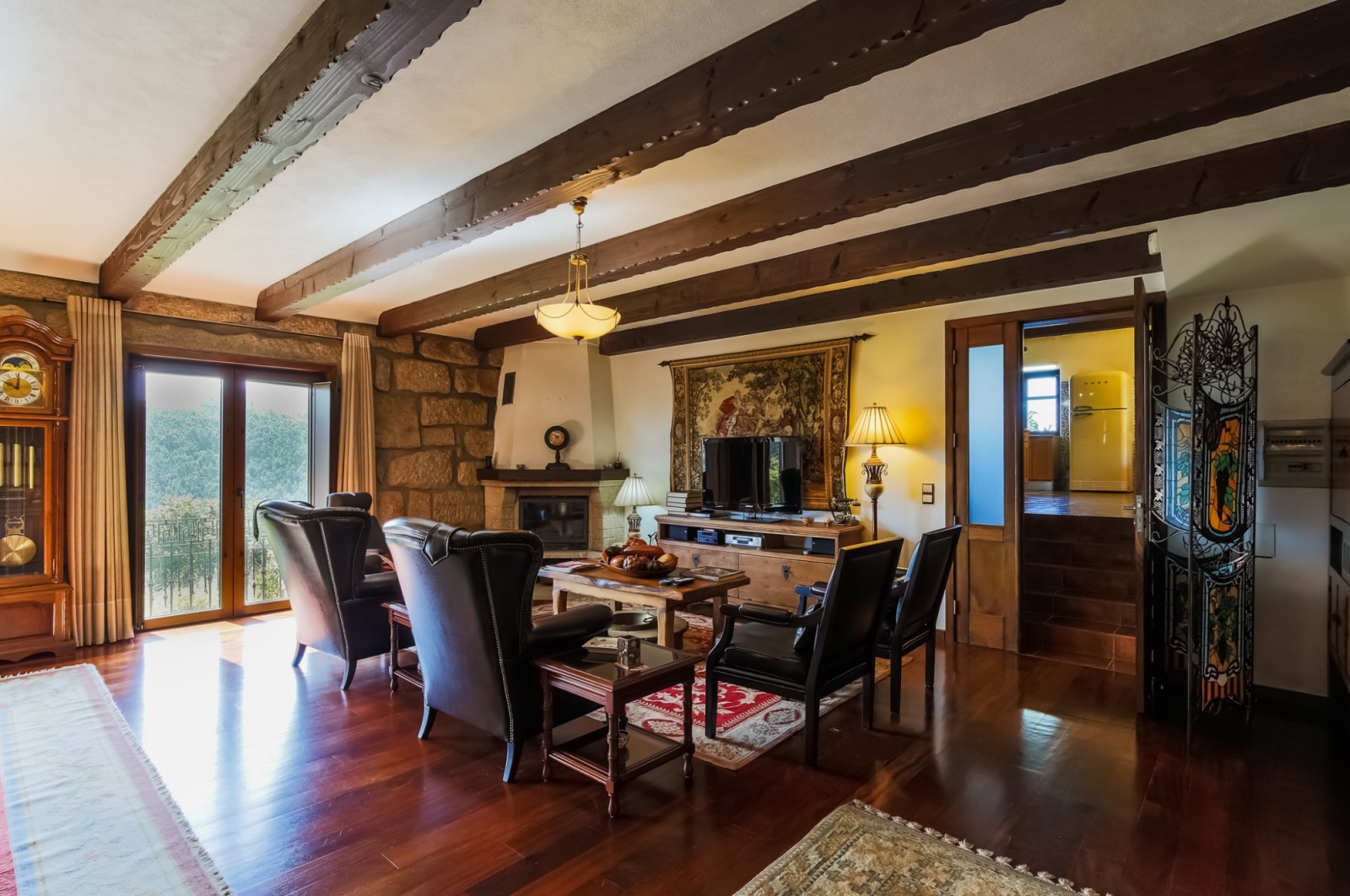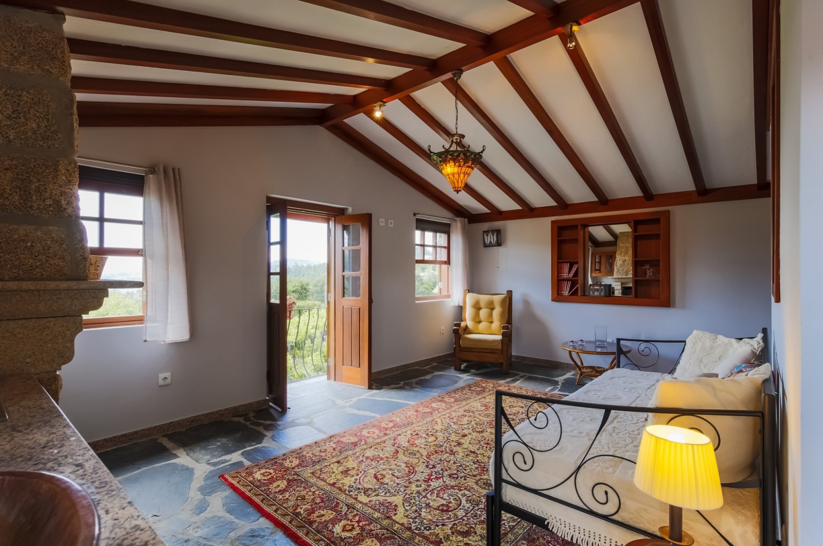 - salão com paredes em pedra à vista, lareira, tecto com vigas em madeira à vista e acesso ao jardim com vistas rio;