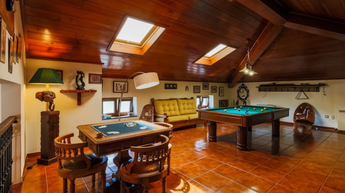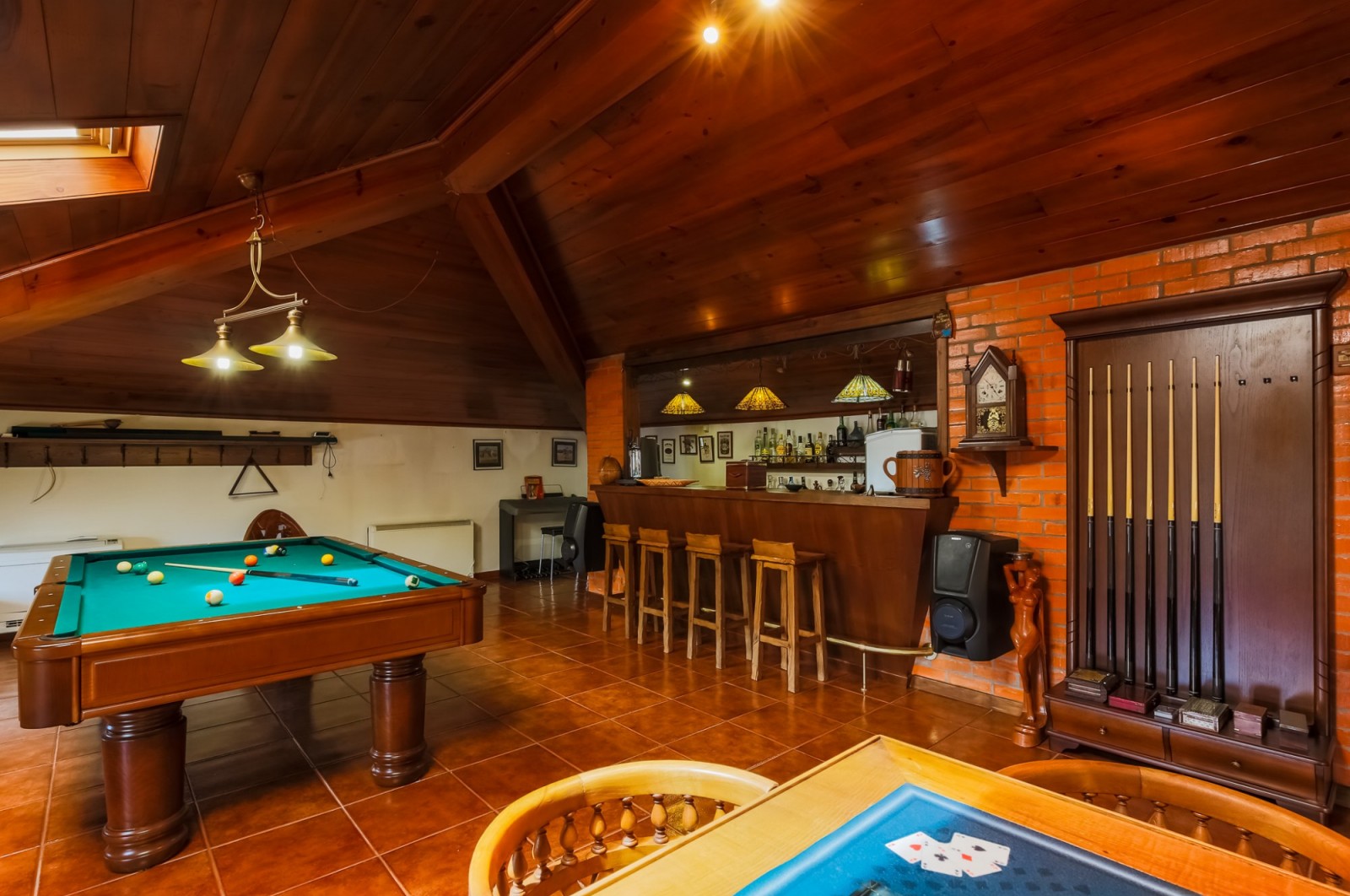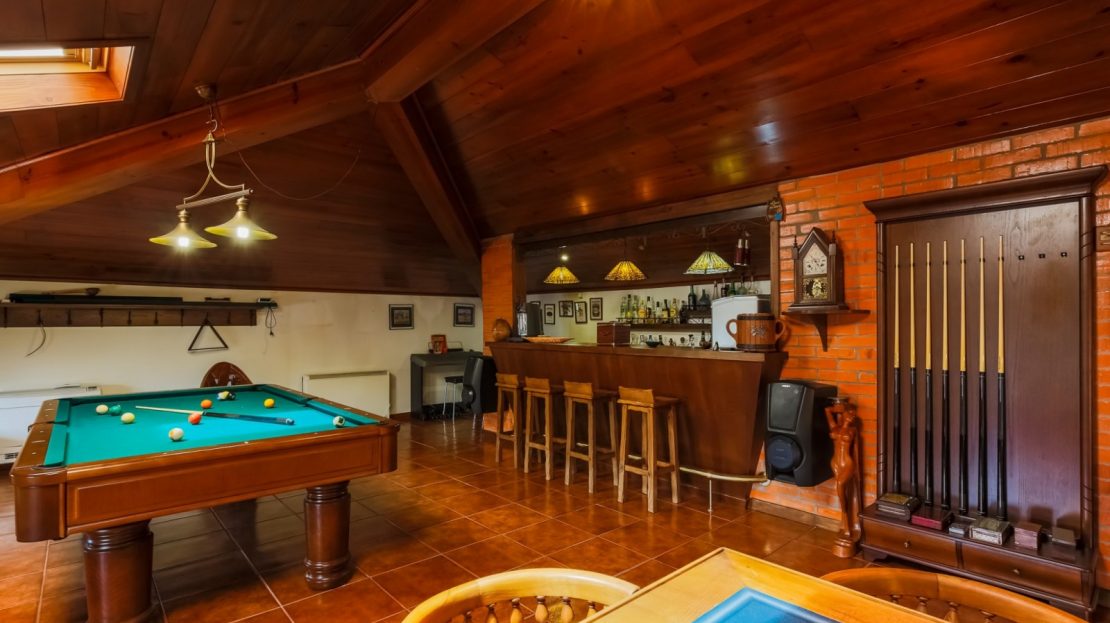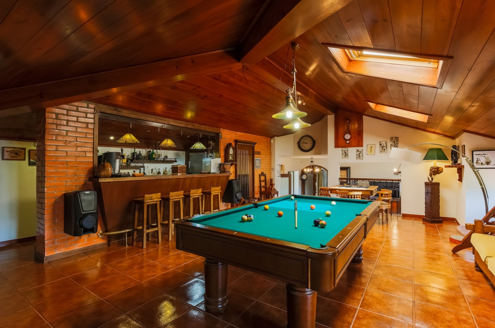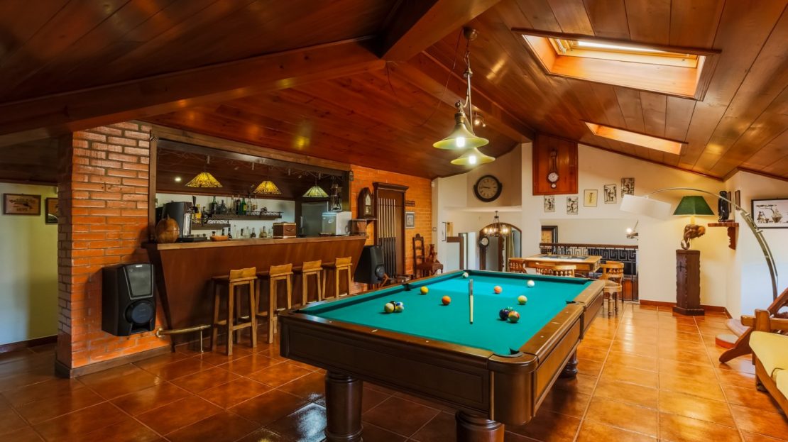 - salão de jogos com bar equipado e tecto revestido a madeira com duas clarabóias;