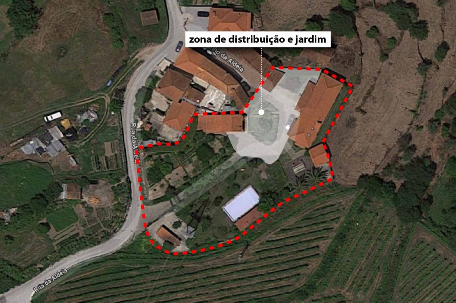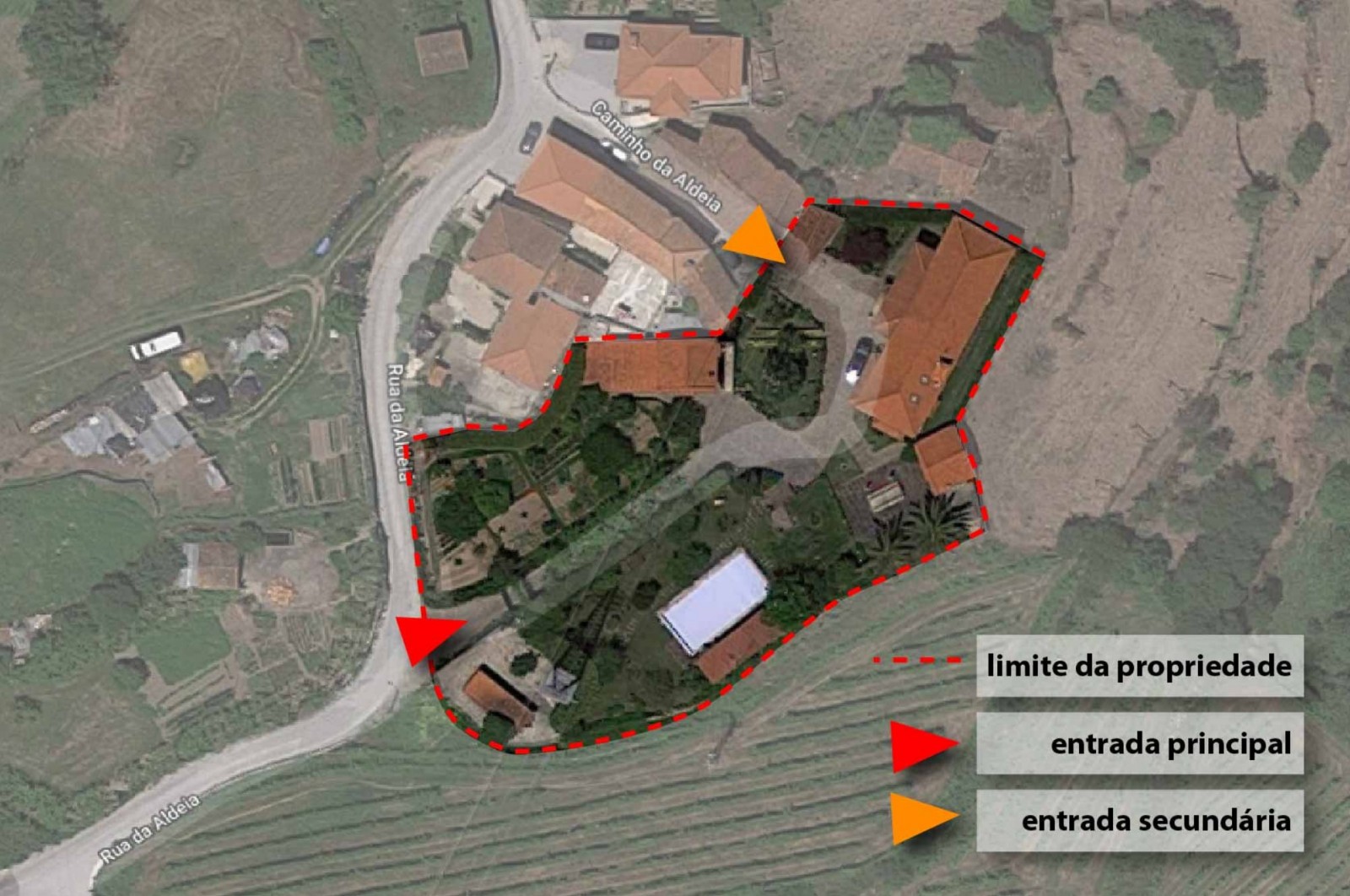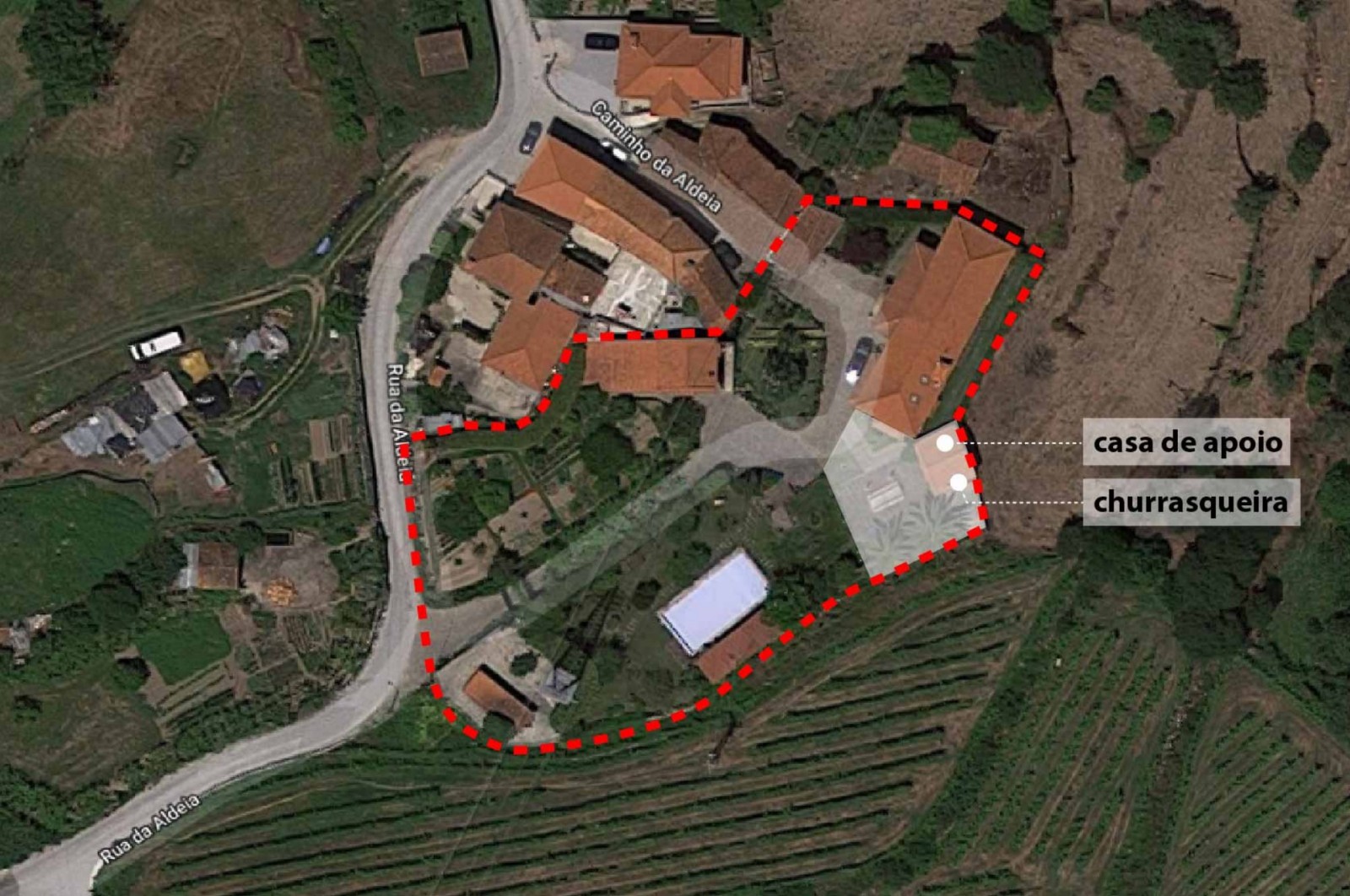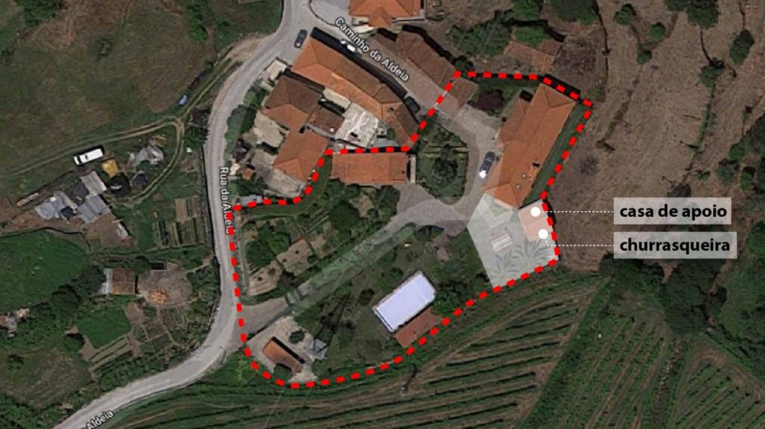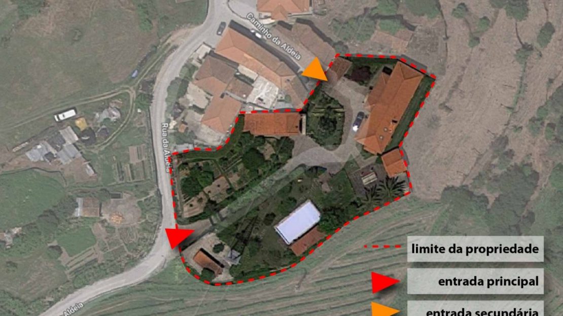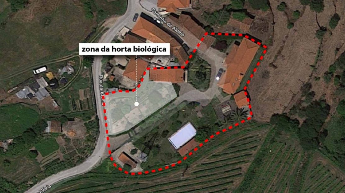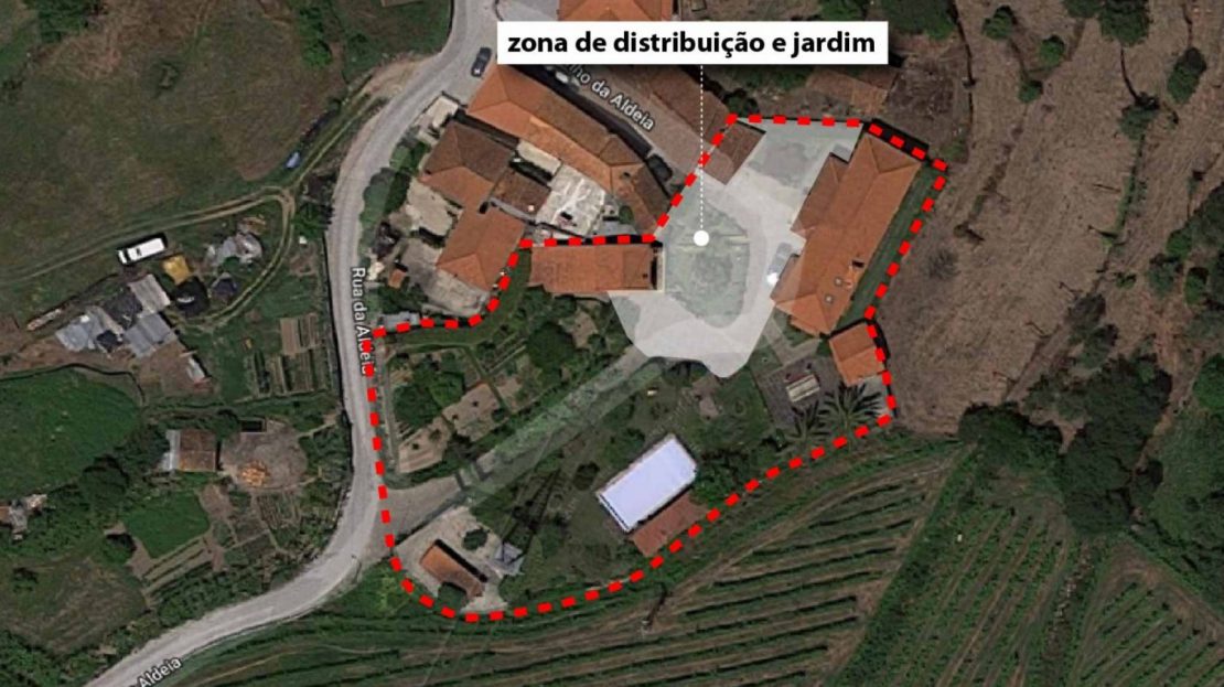 - A principal que atravessa a zona da piscina e da horta biológica, até chegar ao ponto onde as 3 edificações existentes se distribuem;