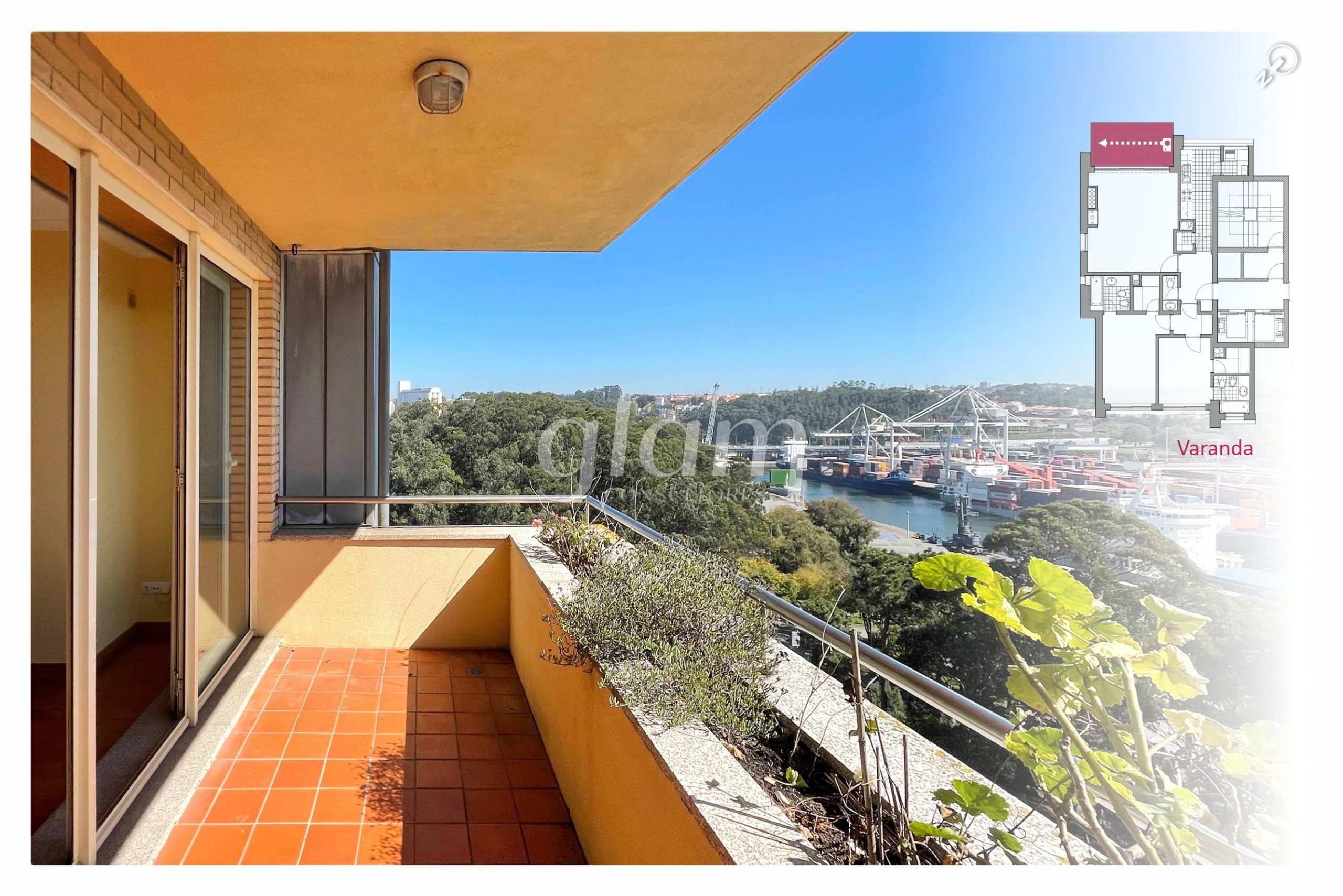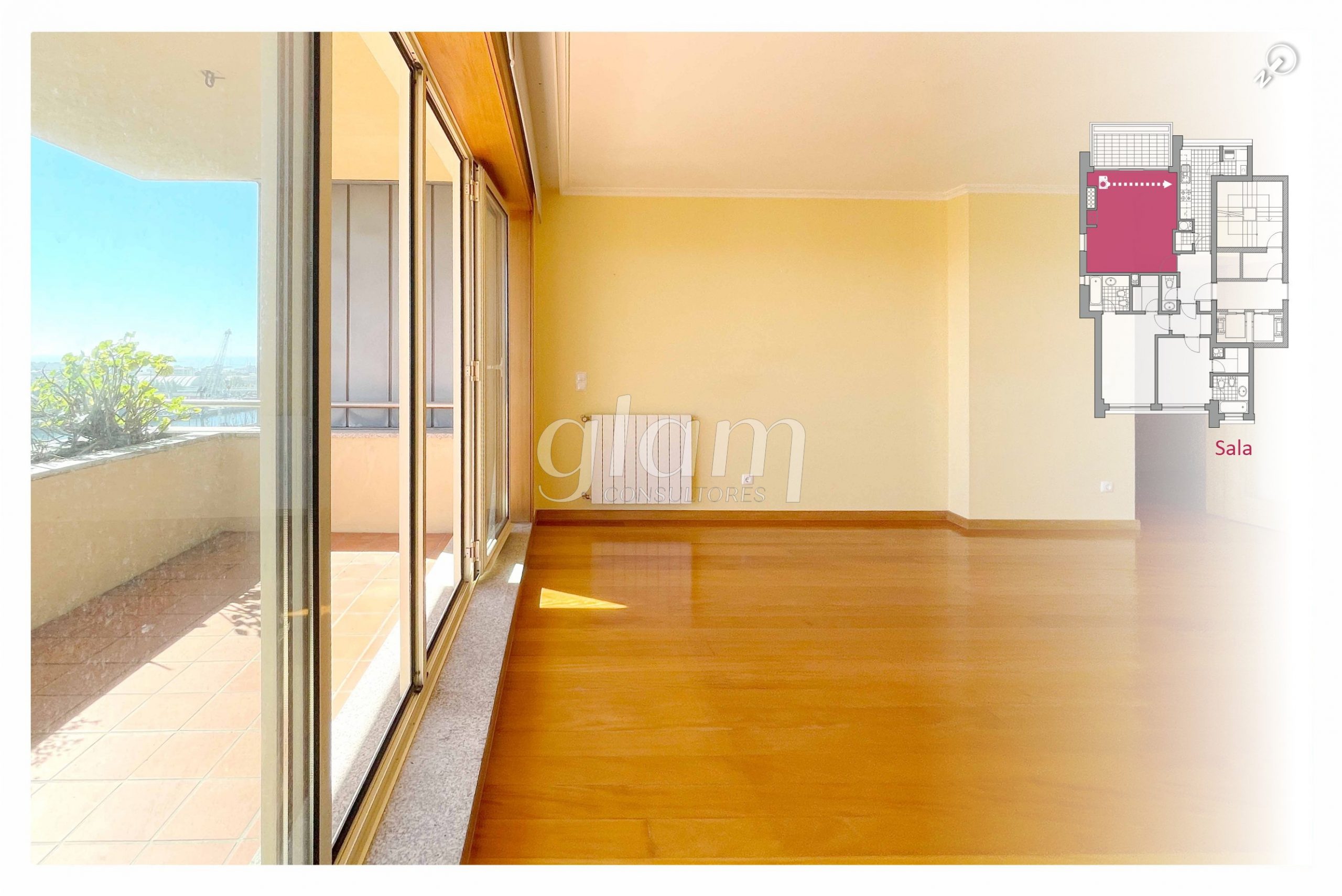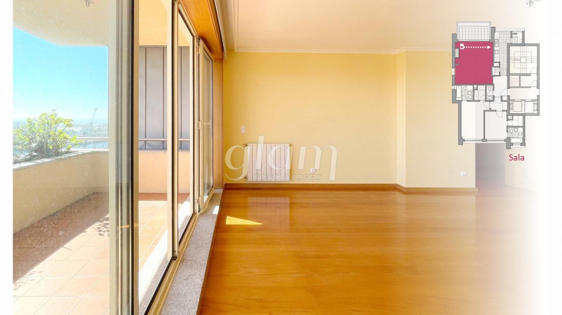 sala com vistas de rio e mar;