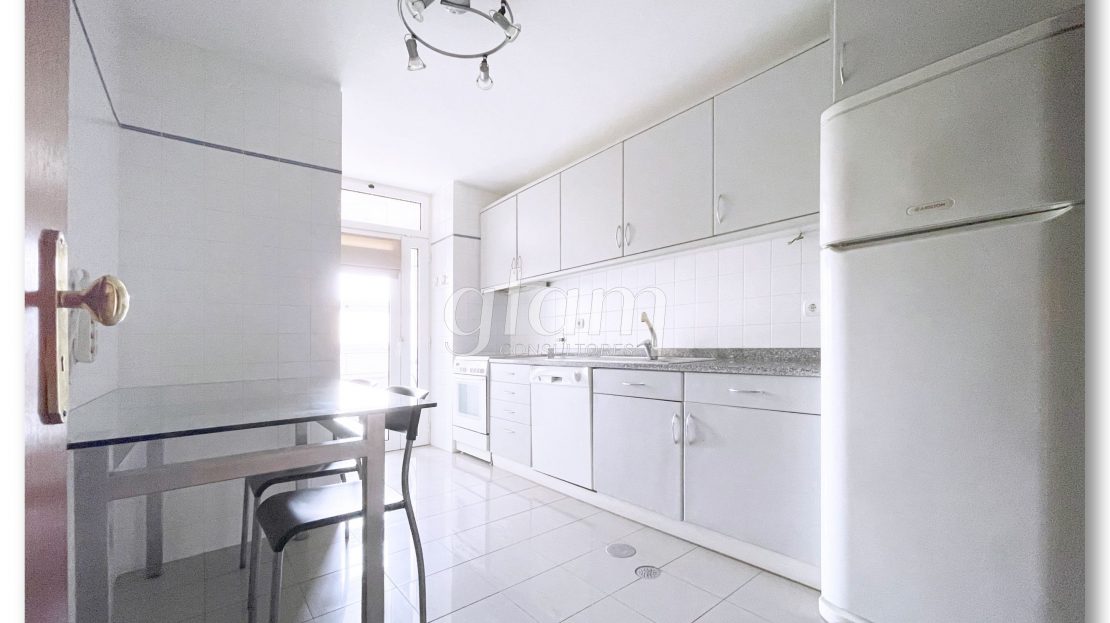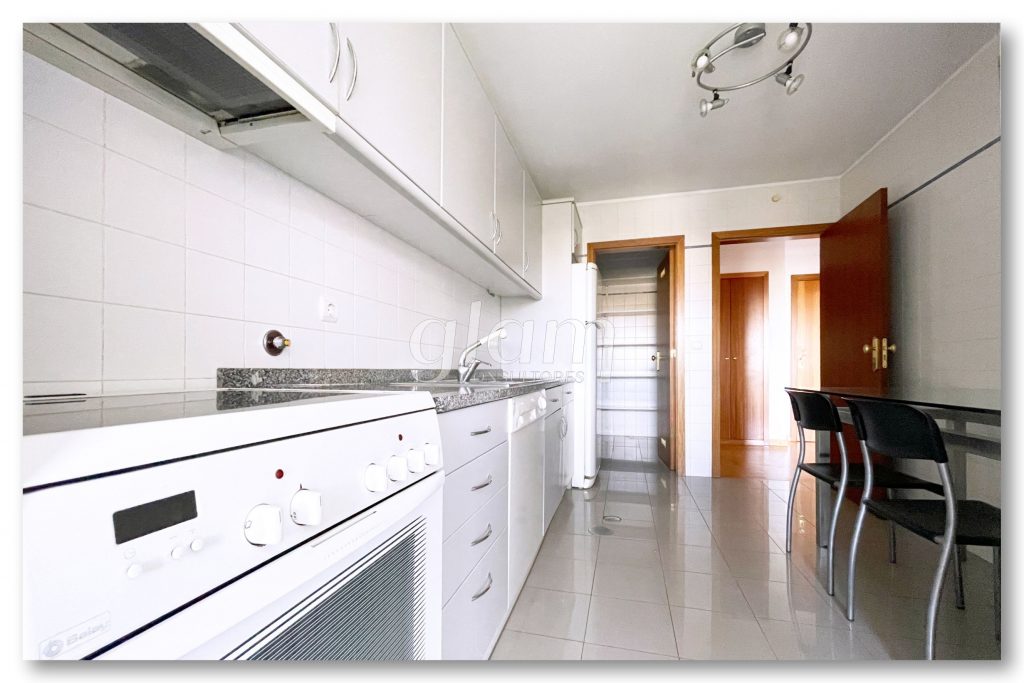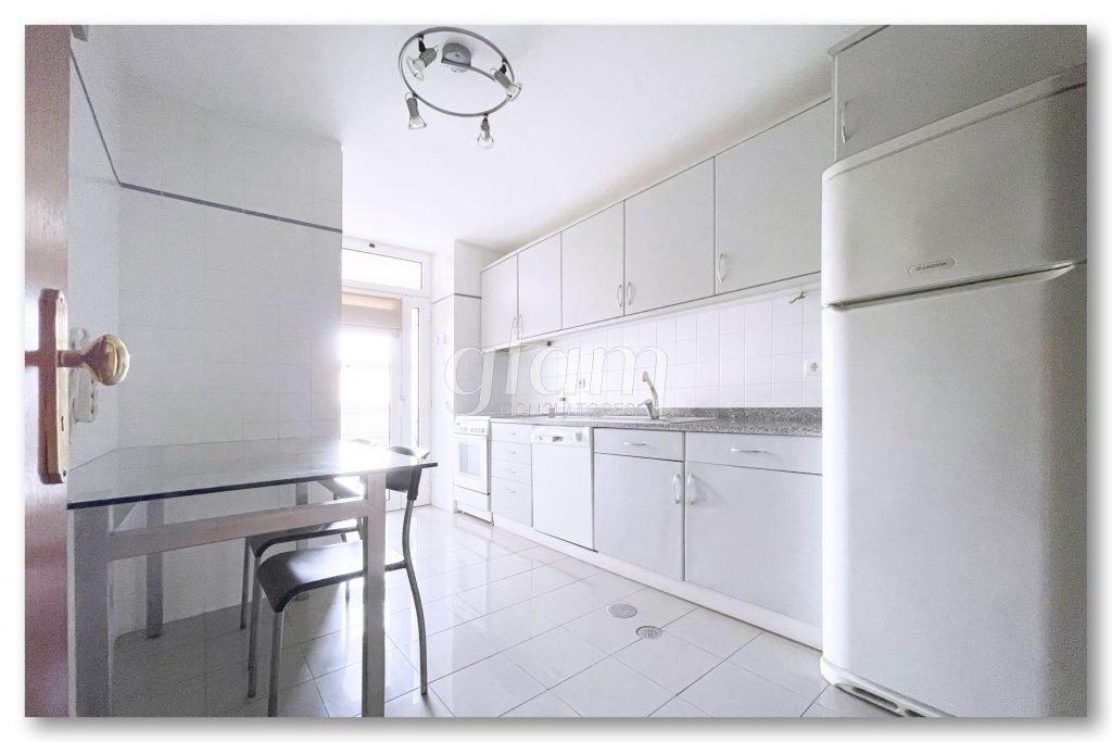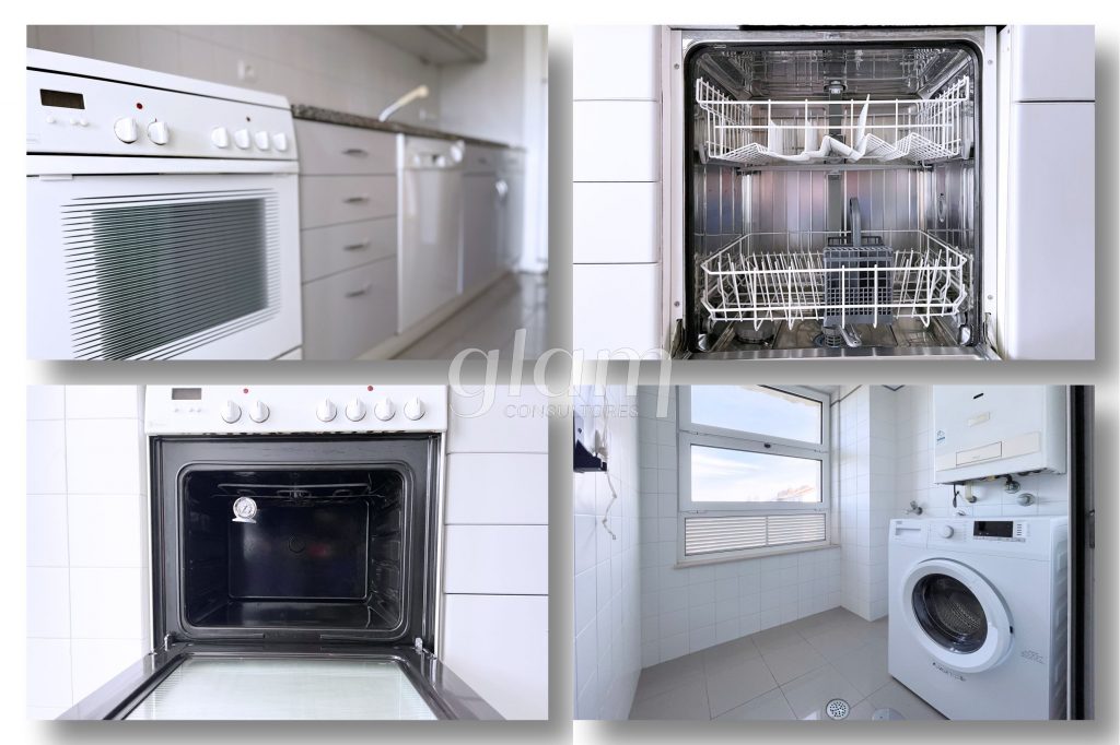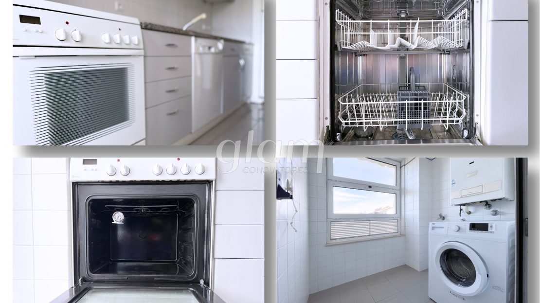 – cozinha mobilada (com mesa de refeições e duas cadeiras) e equipada (placa, forno, exaustor, frigorifico combinado, micro-ondas e máquina de lavar louça);