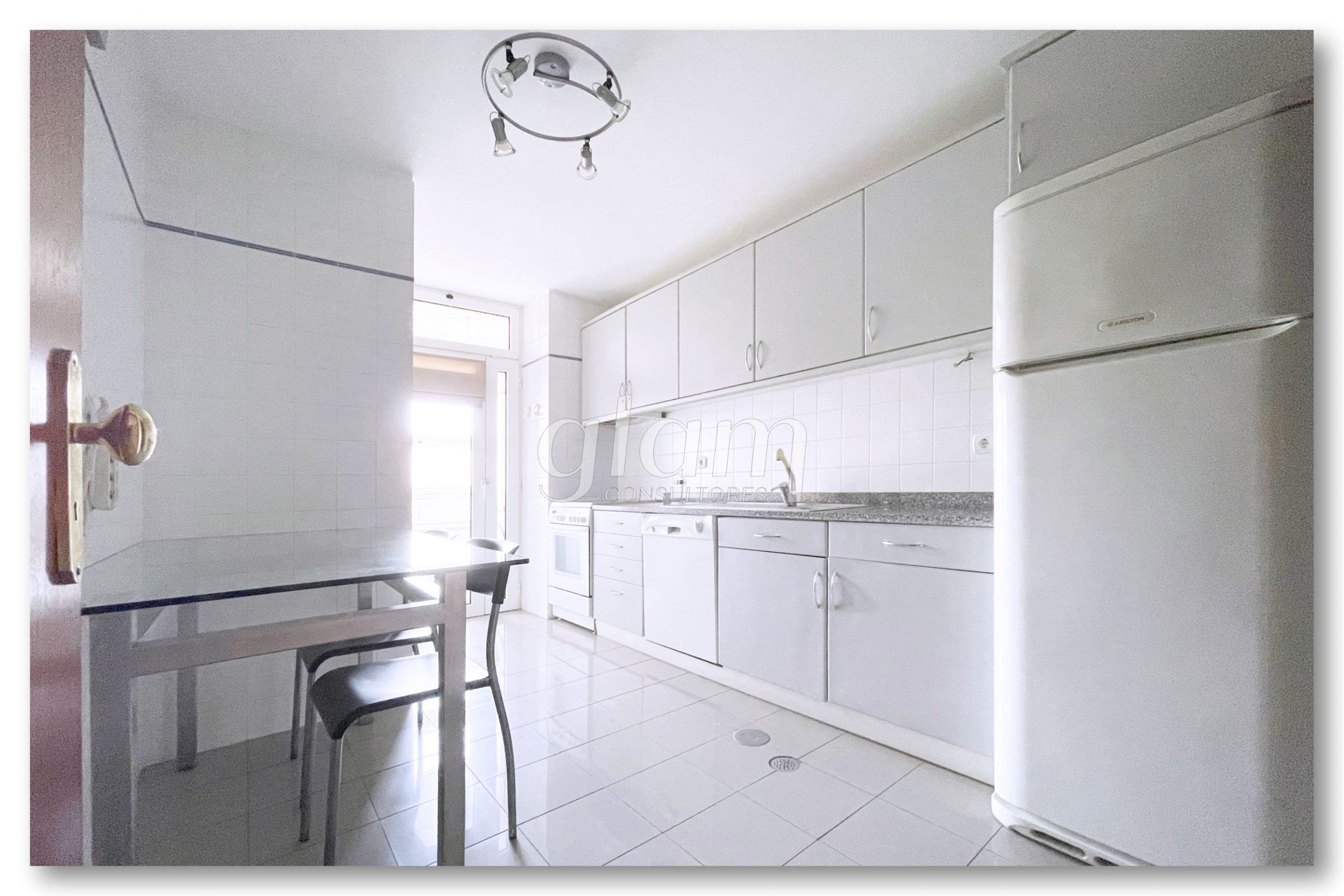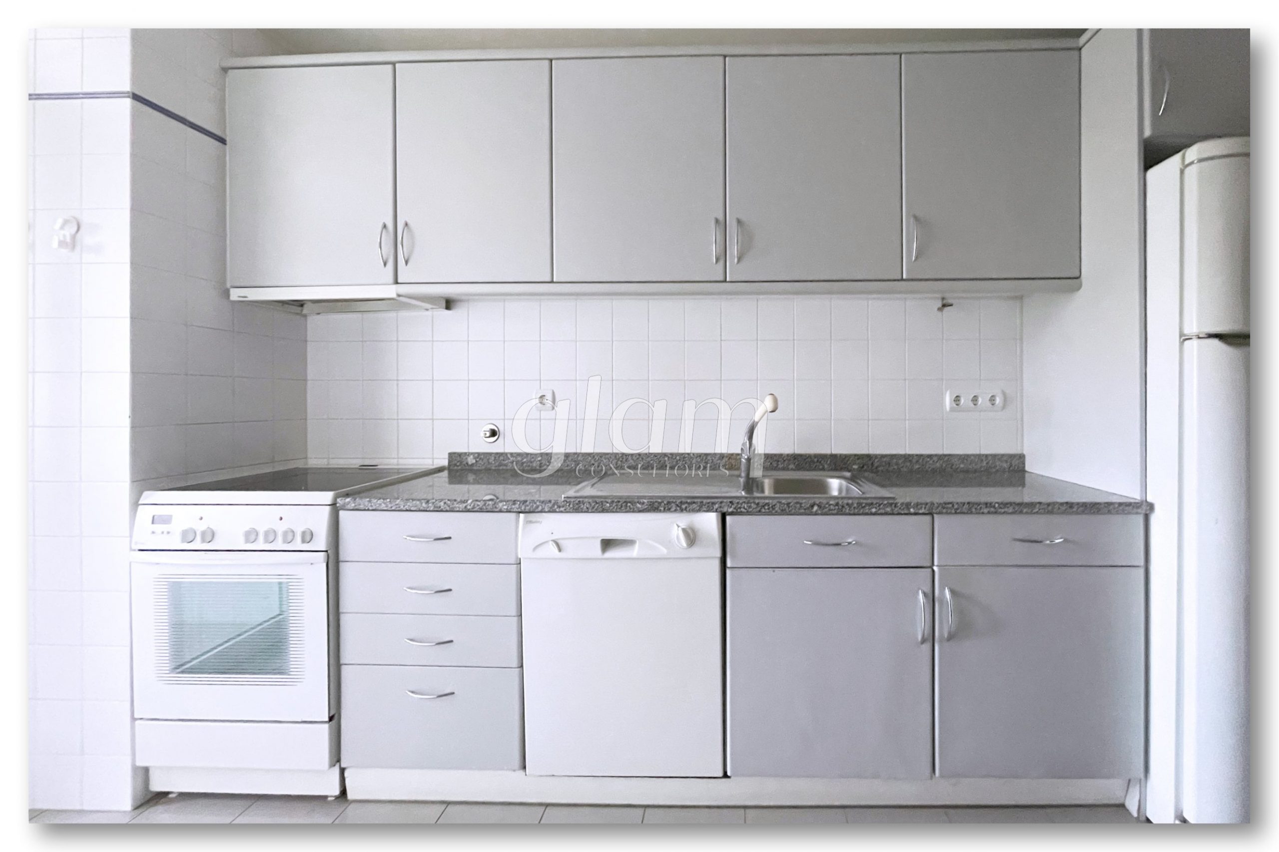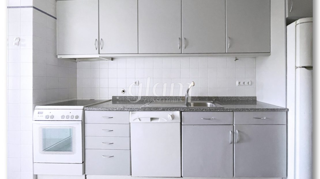 – cozinha mobilada (com mesa de refeições e duas cadeiras) e equipada (placa, forno, exaustor, frigorifico combinado, micro-ondas e máquina de lavar louça);